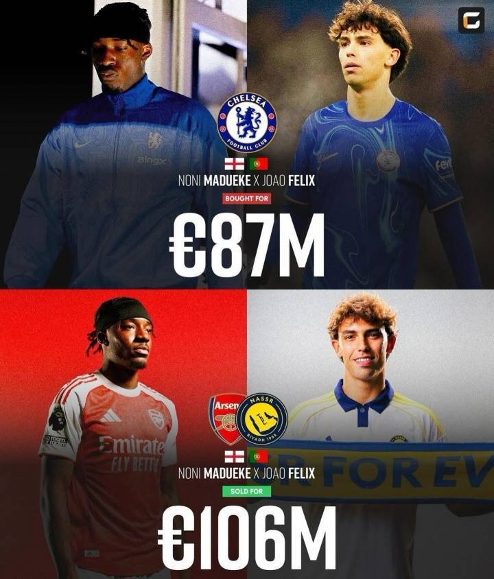2023年1月和2024年8月,切尔西先后签下马杜埃凯、菲利克斯,转会费分别为3500万欧元、5200万欧元,合计8700万欧。